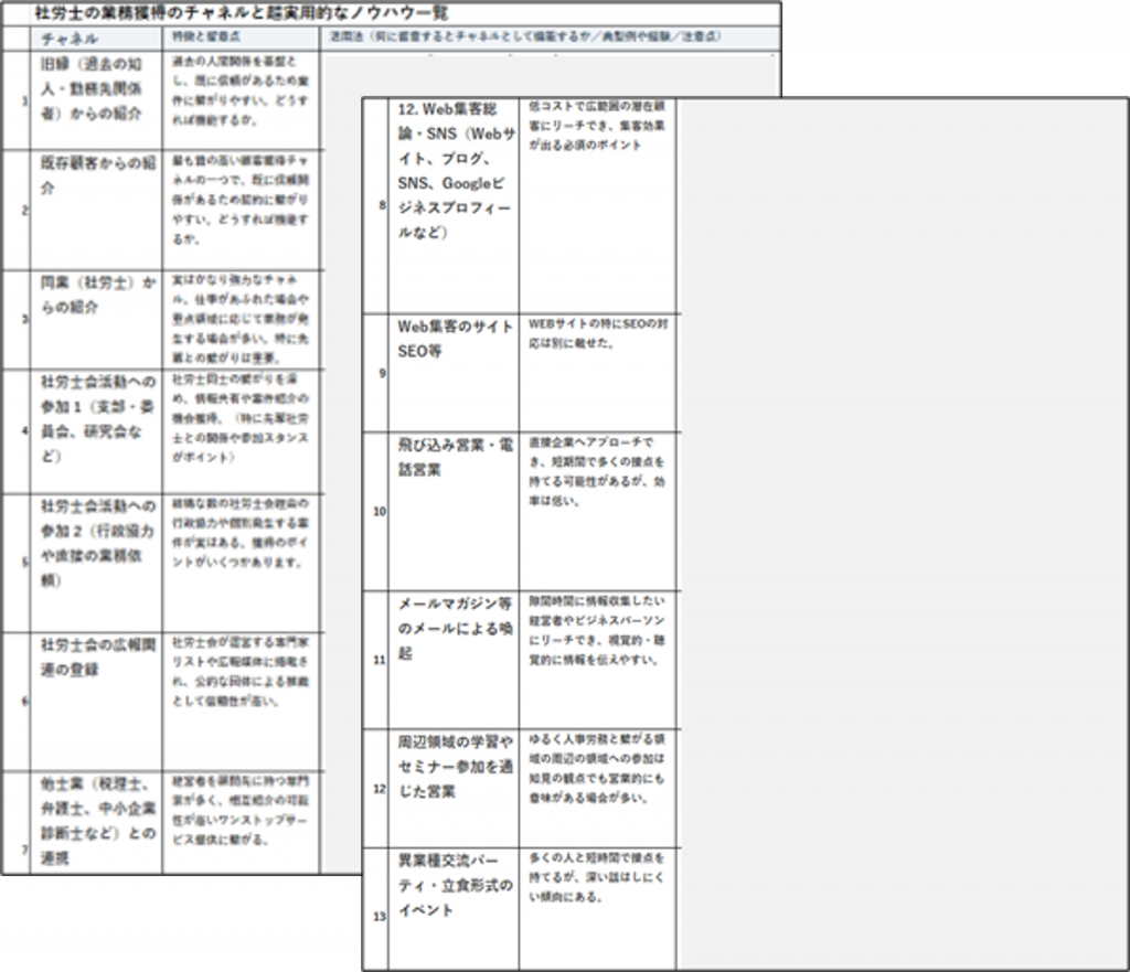 - 「社労士の業務獲得のチャネルと超実用的なノウハウ一覧」を配布:人脈活用、紹介の取り方、情報発信等超実践的ノウハウを30以上列挙