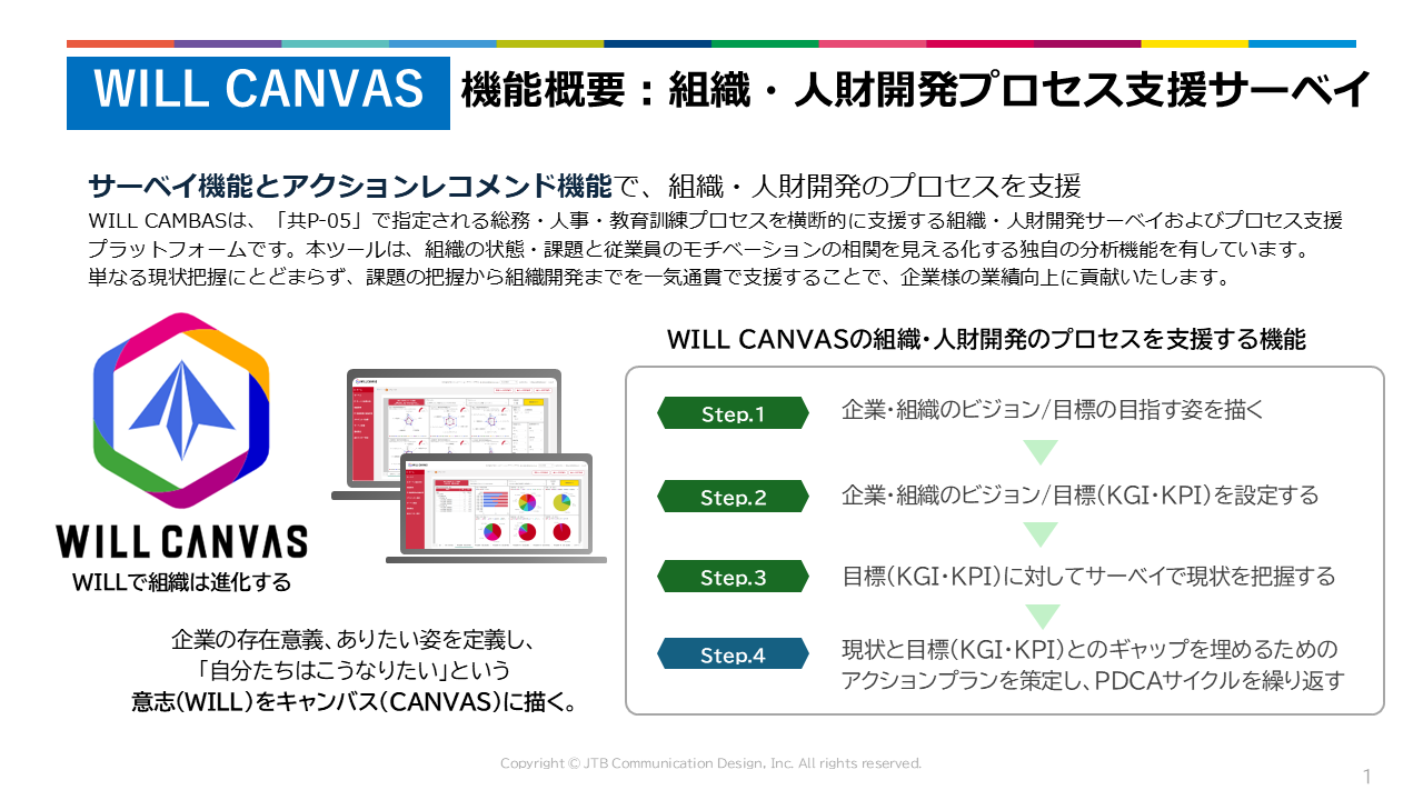 WILL CANVASは、社労士が顧問先企業の組織の状態と社員のモチベーションを可視化し、診断結果をもとに改善まで伴走支援を行うためのサーベイツールです。