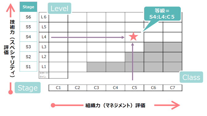 技術力(事業発展への貢献度)と、組織力(組織発展への貢献度) をそれぞれに評価し、その結果をマトリクスマップ上に置くことで、個々人の成長意欲を促進し、総力を結集した組織作りができる人事評価制度です。