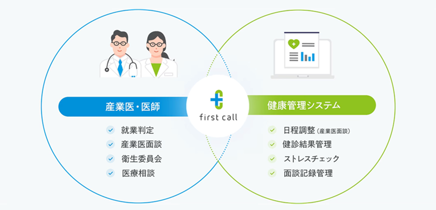 クラウド型健康管理サービス『first call』は、法令上求められる産業医選任や職場巡視、ストレスチェック、就業判定、各種面接指導などの各種産業保健業務をオールインワンで‘まるっと’対応できる産業保健サービスです。