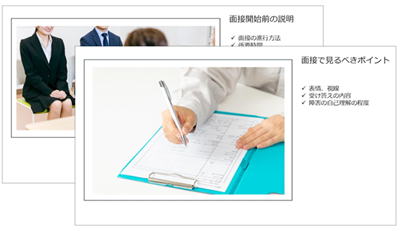 動画、PowerPoint(台本付き)9種類の書式を活用し、社内説明・研修・採用面接・定着面談(定期面談)・日常運用までをすぐに実行。準備に追われることなく、障害者雇用を現場で回し続けられます。経営層説明用に活用できるレジュメもセットしています。