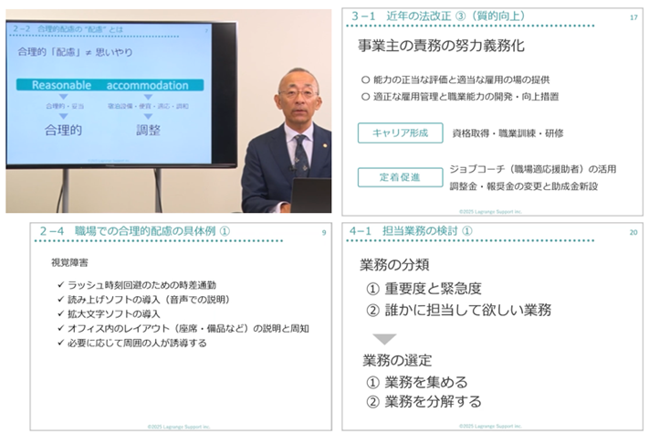 法制度・ダイバーシティの基礎から、採用面接・定着面談(定期面談)・定着支援・職場理解促進まで、断片的ではない“一連の流れ”として障害者雇用の流れを体系的に理解できます。