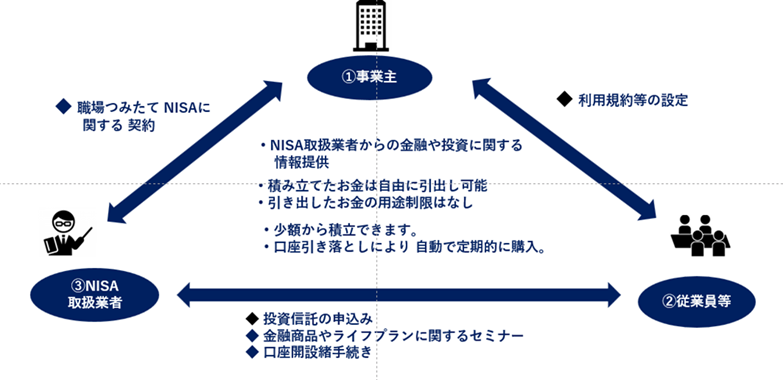 • 事業主(顧問先企業):利用規約の設定を行い、NISA取扱業者から金融・投資に関する情報の提供を受けます
